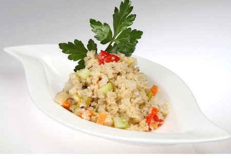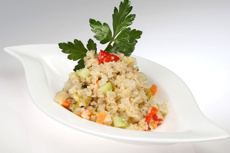 Orientalischer Couscoussalat mit Salatgurken, Sellerie, Lauchzwiebeln, Karotten und Erbsen